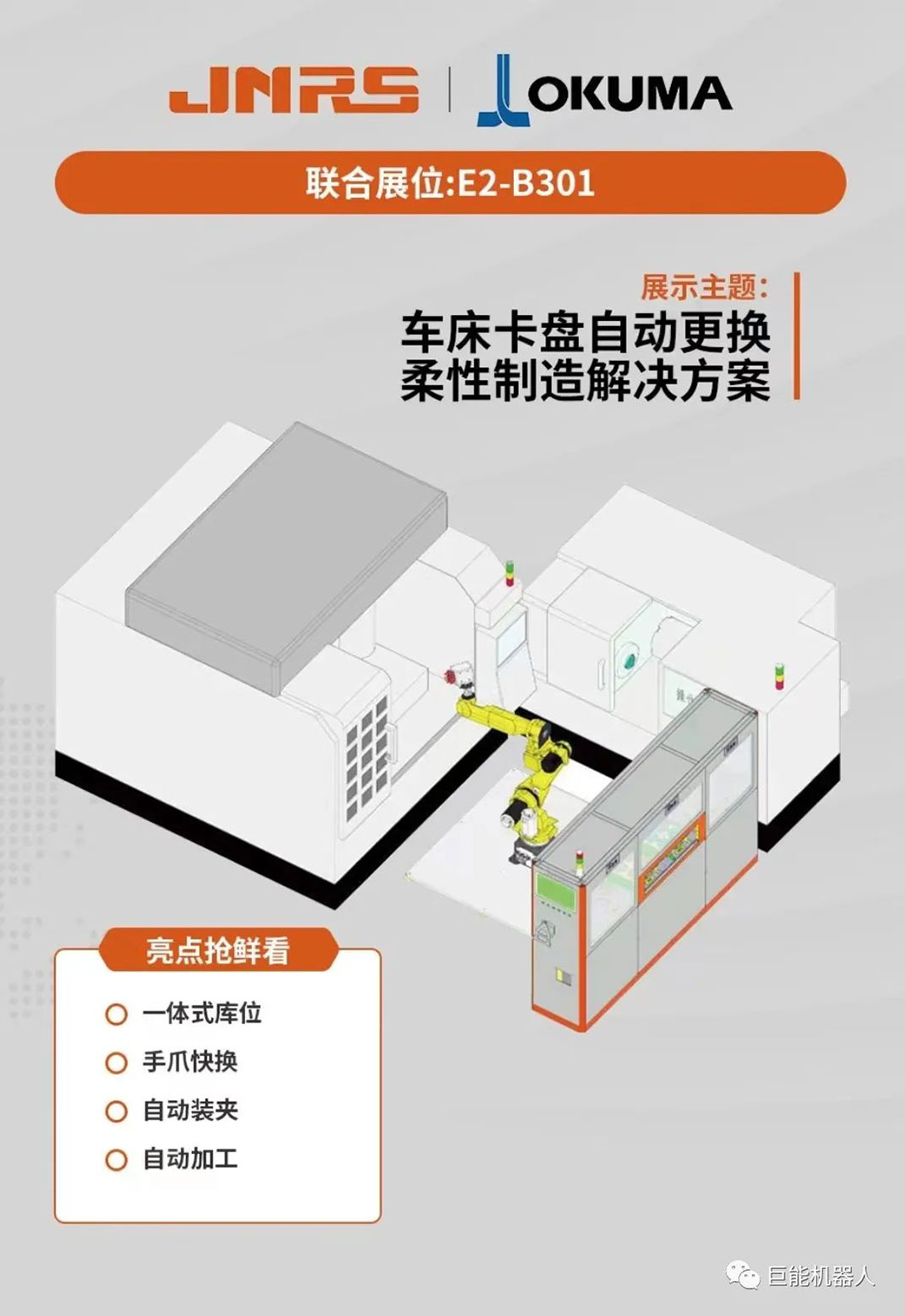 在CIMT2023日本展區E2-B301展位,上海大隈展出了1套自動化單元,這是上海大隈面對智能制造推出的車床卡盤自動柔性制造解決方案,其具有“一體化庫位、手爪快換、自動裝卡、柔性加工”等特點,實現了車床、加工中心、料庫的柔性無縫銜接,為智能制造貢獻了一個MINI版的柔性制造產線解決方案。